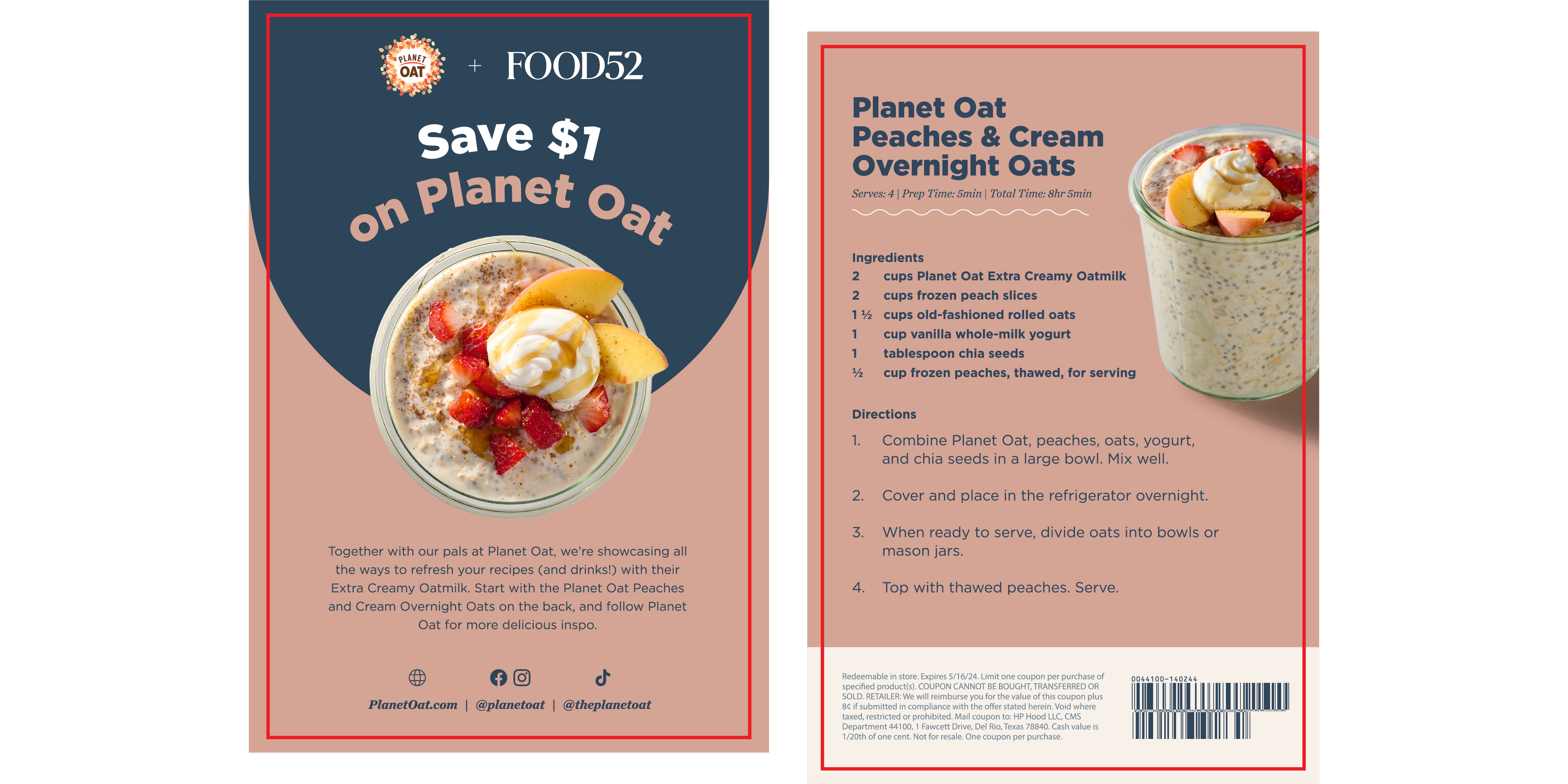 For this project, I was tasked with creating printed 4”x6” inserts for, which would go in every Food52 shipment from April to may 2024. They were created in partnership with Planet Oat, with a disocunted offer and a recipe for overnight oats. The design was created using the Food52 Identity, while using assets from Planet Oat.